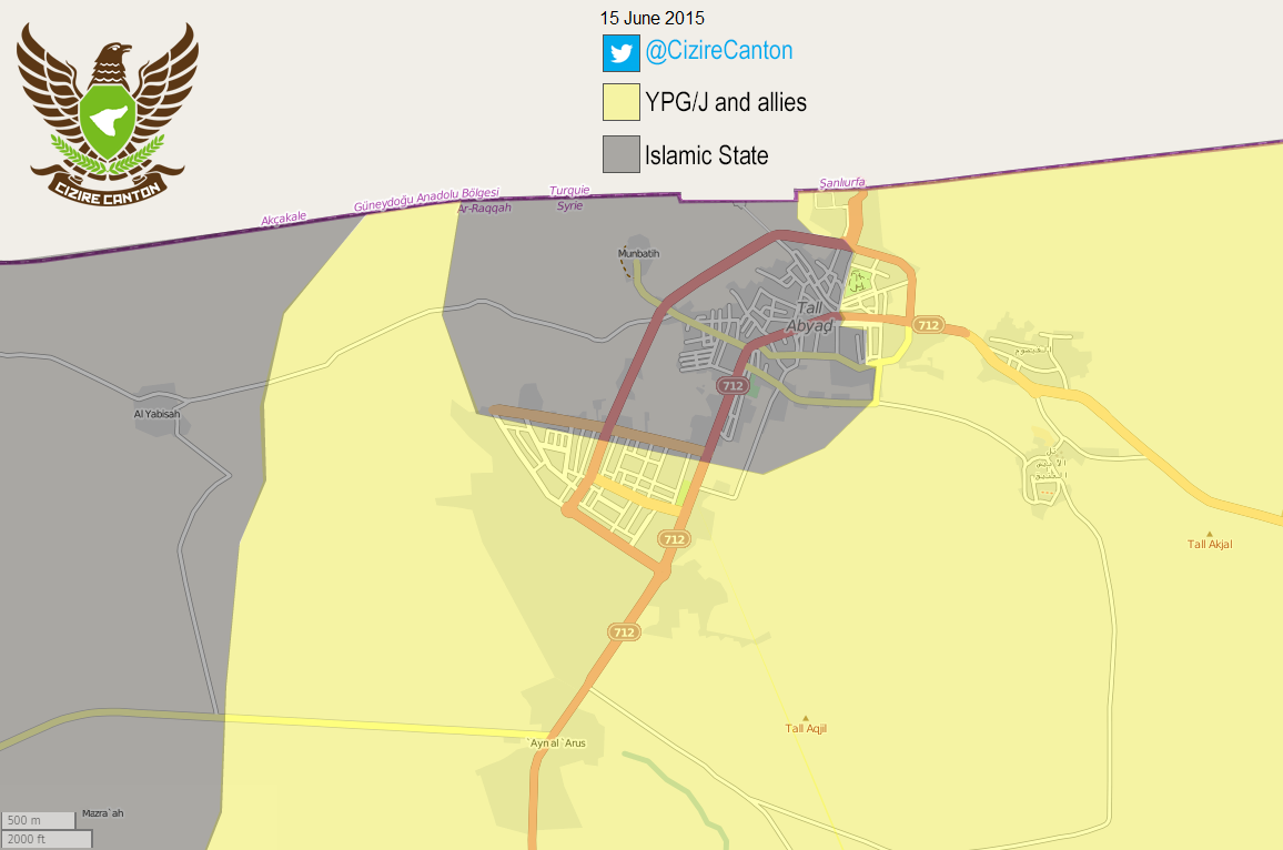 КПП на сирийско-турецкой границе. 15.06.15 - освобождён от присутствия боевиков ИГ совместными действиями подразделений курдской самообороны и вооружённой сирийской оппозиции из группировки "Лива аль-Тахрир". . . . источник